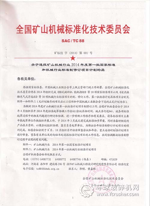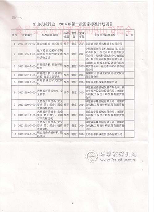 關于通報礦山機械行業(yè)2014年度第一批國家標準和機械行業(yè)標準制修訂項目計劃的函