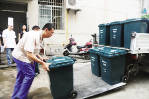 昨日下午,在金永泰大酒店廚房后門,寧波開誠生態(tài)技術(shù)有限公司的餐廚垃圾回收車開到這里,工作人員一一將裝滿餐廚垃圾的桶搬運(yùn)上車。