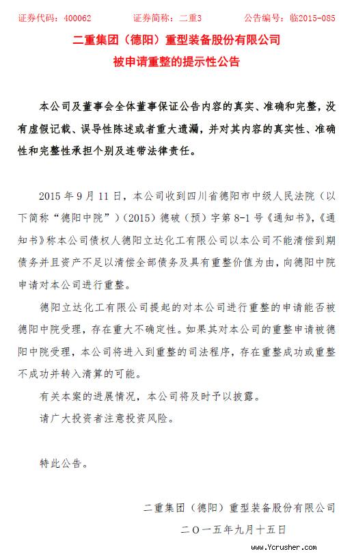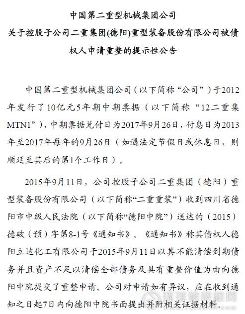 二重重裝周二(9月15日)發(fā)布公告稱,由于公司收到債權人的重整申請,其公司債“08二重債”可能無法按期支付本息。同一天,其母公司中國二重集團也發(fā)布公告稱,這可能導致二重集團中期票據(jù)“12二重集MTN1”利息支付也受到影響。