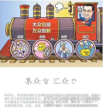 月9日,李克強(qiáng)總理在大連考察時(shí)提出,“只要集眾智匯眾力,我們就一定能成大事,就一定能為經(jīng)濟(jì)發(fā)展注入澎湃動(dòng)力。”僅僅7天后,建設(shè)大眾創(chuàng)業(yè)、萬眾創(chuàng)新支撐平臺(tái)便成為了國務(wù)院常務(wù)會(huì)議的議題。會(huì)議決定,要利用“互聯(lián)網(wǎng)+”,積極發(fā)展眾創(chuàng)、眾包、眾扶、眾籌等新模式,形成創(chuàng)新驅(qū)動(dòng)發(fā)展新格局。 據(jù)中國日?qǐng)?bào)