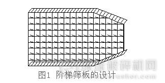 (2)階梯篩板的設(shè)計(jì)實(shí)現(xiàn)分層后的粘土磚與混凝土塊物料移動(dòng)。圖1為階梯篩板的設(shè)計(jì),階梯篩板在特有的振動(dòng)方式與頻率下給予混凝土塊在下層移動(dòng)的動(dòng)力進(jìn)而實(shí)現(xiàn)混凝土塊沿階梯篩板向上移動(dòng)。階梯篩板的運(yùn)動(dòng)軌跡為橢圓形,在振動(dòng)電機(jī)的帶動(dòng)之下運(yùn)動(dòng)每一個(gè)周期,篩板階梯推動(dòng)混凝土塊向上移動(dòng)0——2個(gè)篩孔間隔。