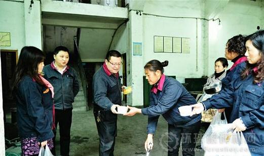 當(dāng)日下午14點(diǎn),該廠15名職工家屬協(xié)管員、廠工會(huì)女工委員,兵分三路,抬上剛熬制好的玉米粥,分赴到了洗煤、機(jī)修、發(fā)電、運(yùn)輸、電檢等基層單位生產(chǎn)現(xiàn)場(chǎng),為一線的職工端上熱氣騰騰的玉米粥,送上面包。400多碗玉米粥,360個(gè)面包,一句句語(yǔ)重心長(zhǎng)、苦口婆心的叮囑,讓?shí)徫宦毠じ械搅藵鉂獾恼媲椤D為家屬協(xié)管員們送溫暖的鏡頭。何建民 王玉亭