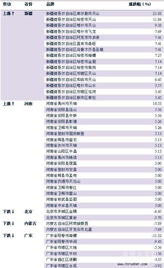 從價格出現(xiàn)變動的主要省份具體情況上看,周內(nèi),新疆的喀什、烏魯木齊、哈密、阿克蘇、和田等地的天山(261.67元/噸,0.64%)、海螺(230.9元/噸,0.37%)、青松的主要品牌水泥價格均有10-20元/噸的提價,停窯限產(chǎn)之后加上企業(yè)自律一致使得地區(qū)價格得以上浮;河南省內(nèi)各地廠家在18日普遍上調(diào)各主要各規(guī)格水泥價格15-20元/噸左右。而北京的金隅(232.5元/噸,0%)、黃巖兩品牌價格有10-20元/噸的降幅,內(nèi)蒙古的阿榮旗、牙克石地區(qū)主要品牌水泥價格下調(diào)30元/噸,廣東地區(qū)的市轄區(qū)、陽春等地的海螺、臺泥(223.33元/噸,0%)、中材主導(dǎo)企業(yè)價格有5-30元/噸不等的下滑
