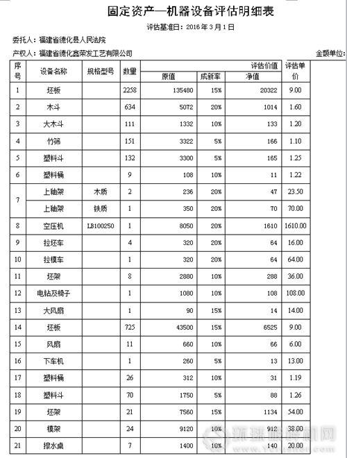 一、拍賣標(biāo)的:位于福建省德化縣龍潯鎮(zhèn)寶美村環(huán)城路,被執(zhí)行人福建省德化鑫榮發(fā)工藝有限公司在租賃廠房?jī)?nèi)的坯架、坯板、