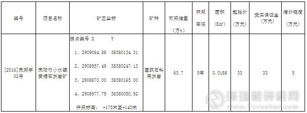 根據(jù)《中華人民共和國礦產(chǎn)資源法》等法律法規(guī)的規(guī)定,受耒陽市國土資源局委托,本局決定由耒陽市土地礦產(chǎn)交易中心以掛牌方式出讓該1宗礦業(yè)權(quán),現(xiàn)將有關(guān)情況公告如下: