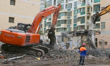 破碎機、挖掘老虎機吊升至12號樓頂,自上而下進行拆除。