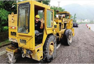 7月18日,來自美國的工程師丹尼·迪歐、邁克·盧德威克正在紹甘線“白改黑”改造工程南岸村施工路段操作一臺原裝進口共振式混凝土破碎設(shè)備。