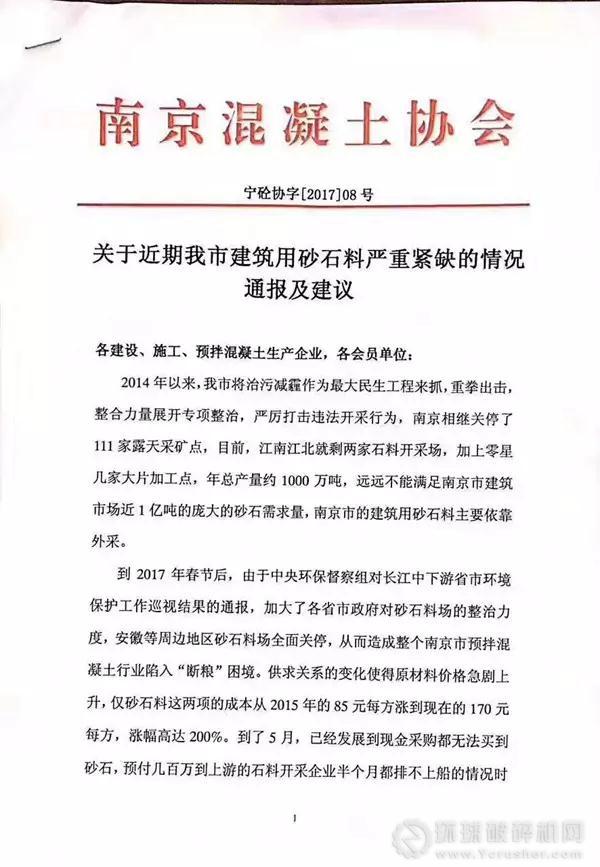 據(jù)了解,2017年5月26日,南京混凝土協(xié)會(huì)發(fā)布《關(guān)于近期我市建筑用砂石料嚴(yán)重緊缺的情況通報(bào)及建議》文件,文件介紹:南京江南江北僅剩兩家石料開采場,加上零星幾家大片加工點(diǎn),南京市砂石料年產(chǎn)總量約1000萬噸,遠(yuǎn)遠(yuǎn)不能滿足南京建筑市場近1億噸的龐大的砂石需求量,南京市的建筑用砂石料主要依靠外采。