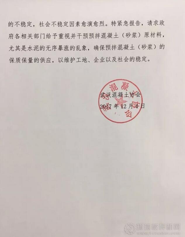 目前,部分預(yù)拌混凝土(砂漿)企業(yè)已經(jīng)停產(chǎn),為此,武漢混凝土協(xié)會請求政府各相關(guān)部門給予重視并干預(yù)預(yù)拌混凝土(砂漿)原材料,尤其是水泥的無序暴漲的亂象,確保預(yù)拌混凝土(砂漿)的保質(zhì)保量的供應(yīng),以維護(hù)工地、企業(yè)以及社會的穩(wěn)定。