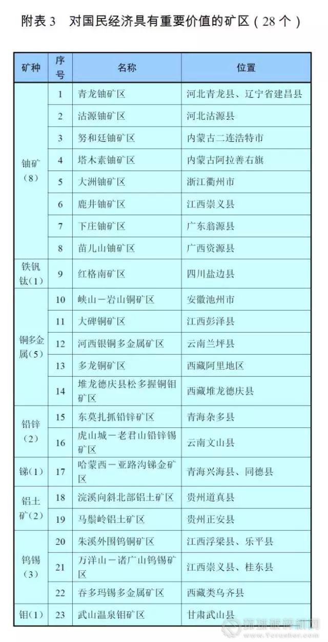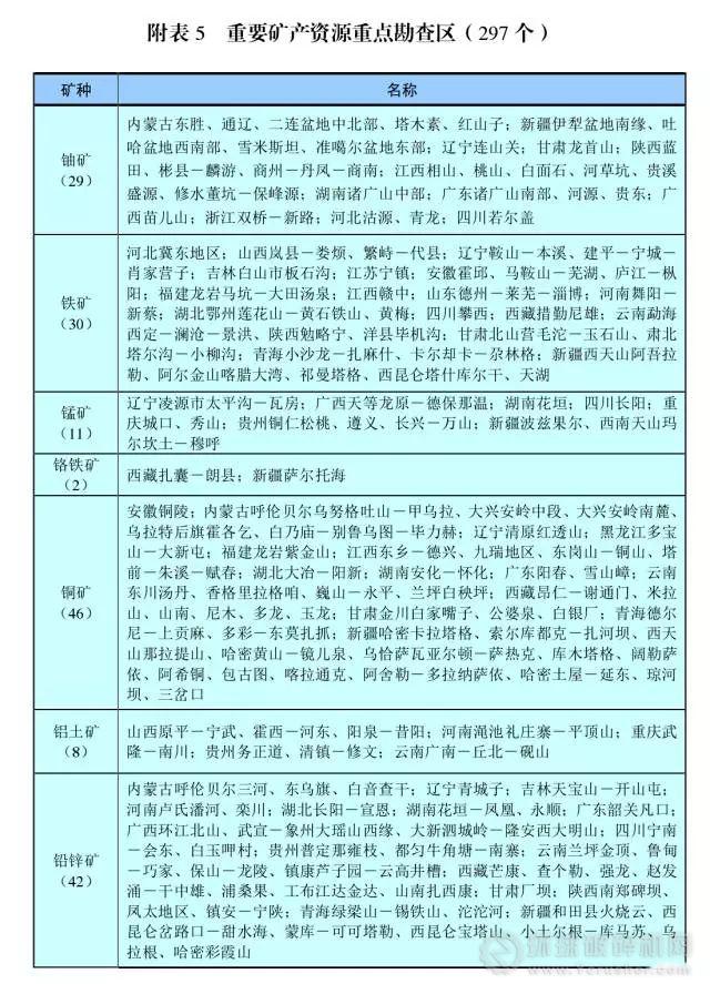 2016年底,國土資源部、國家發(fā)改委、工信部、財政部、環(huán)保部、商務部共同組織編制《全國產(chǎn)資源規(guī)劃(2016-2020年)》,其中劃定了103個能源資源基地,28個重要礦區(qū)及297個重點勘查區(qū)。