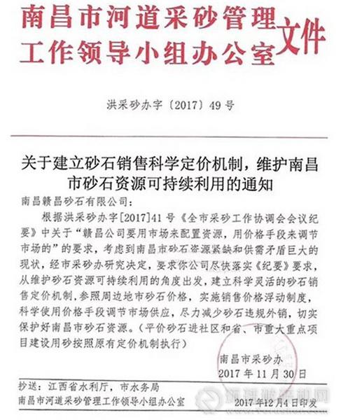 12月4日,南昌市河道采砂管理工作領(lǐng)導(dǎo)小組發(fā)布文件,根據(jù)目前南昌市砂石資源緊缺和供需矛盾巨大的現(xiàn)狀,要求贛昌砂石根據(jù)市場情況進行定價,盡力減少砂石外銷。平價砂石進社區(qū)和重點工程用砂按原有定價機制進行。