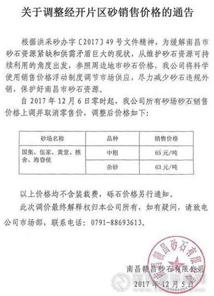隨后,贛昌砂石發(fā)布調(diào)價通告,對砂石市場價格進行了調(diào)整,其中,中粗砂65元/噸,雜砂63元/噸,并取消了零售價,南昌市其他使用單位可前往購買。