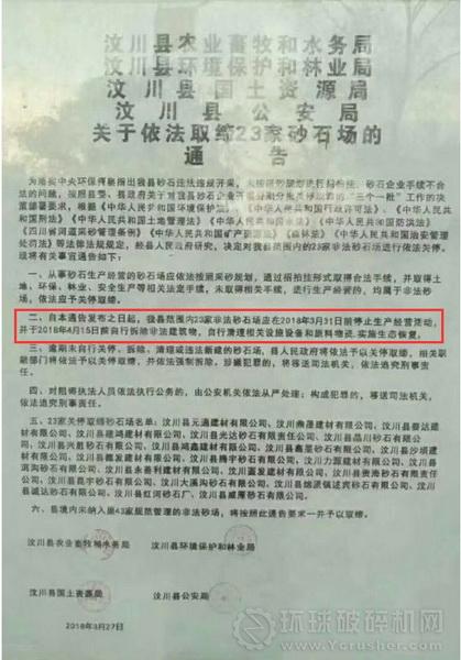 四川省汶川縣相關(guān)部門要求,3月31日之前23家非法砂石廠停止經(jīng)營活動,并于4月15日前拆除非法建筑物,自行清理相關(guān)設(shè)施和原料物資,實施生態(tài)恢復(fù),并在6月底前取締第三批10家砂場!