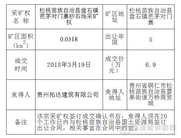 根據(jù)市場需要,按照《中華人民共和國礦產(chǎn)資源法》、《礦產(chǎn)資源開采登記管理辦法》、國土資源部《關(guān)于印發(fā)〈探礦權(quán)采礦權(quán)招標(biāo)拍賣掛牌管理辦法(試行)〉的通知》等文件精神,銅仁市公共資源交易中心松桃分中心受松桃苗族自治縣國土資源局委托,于 2018年 3 月 5 日至 2018 年 3 月 16 日 17 時(shí)時(shí)。在銅仁市公共資源交易中心松桃分中心掛牌出讓成交1宗采礦權(quán)(松礦交易告字〔2018〕4號),現(xiàn)將交易結(jié)果公示如下: