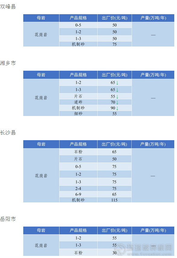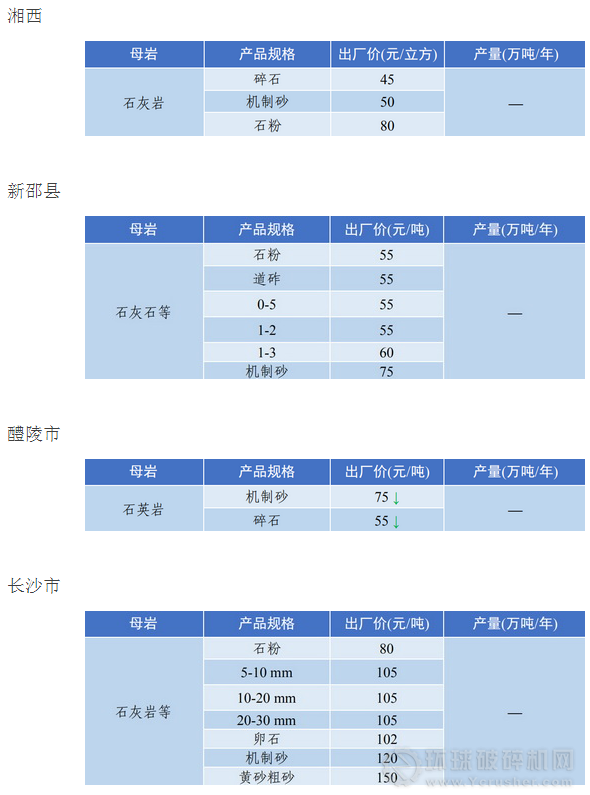 湖南省砂石價(jià)格漲跌互現(xiàn),其中,長沙市砂石價(jià)格維持高位,砂石出廠價(jià)均價(jià)在100元每噸以上,石粉出廠價(jià)高達(dá)80元每噸;