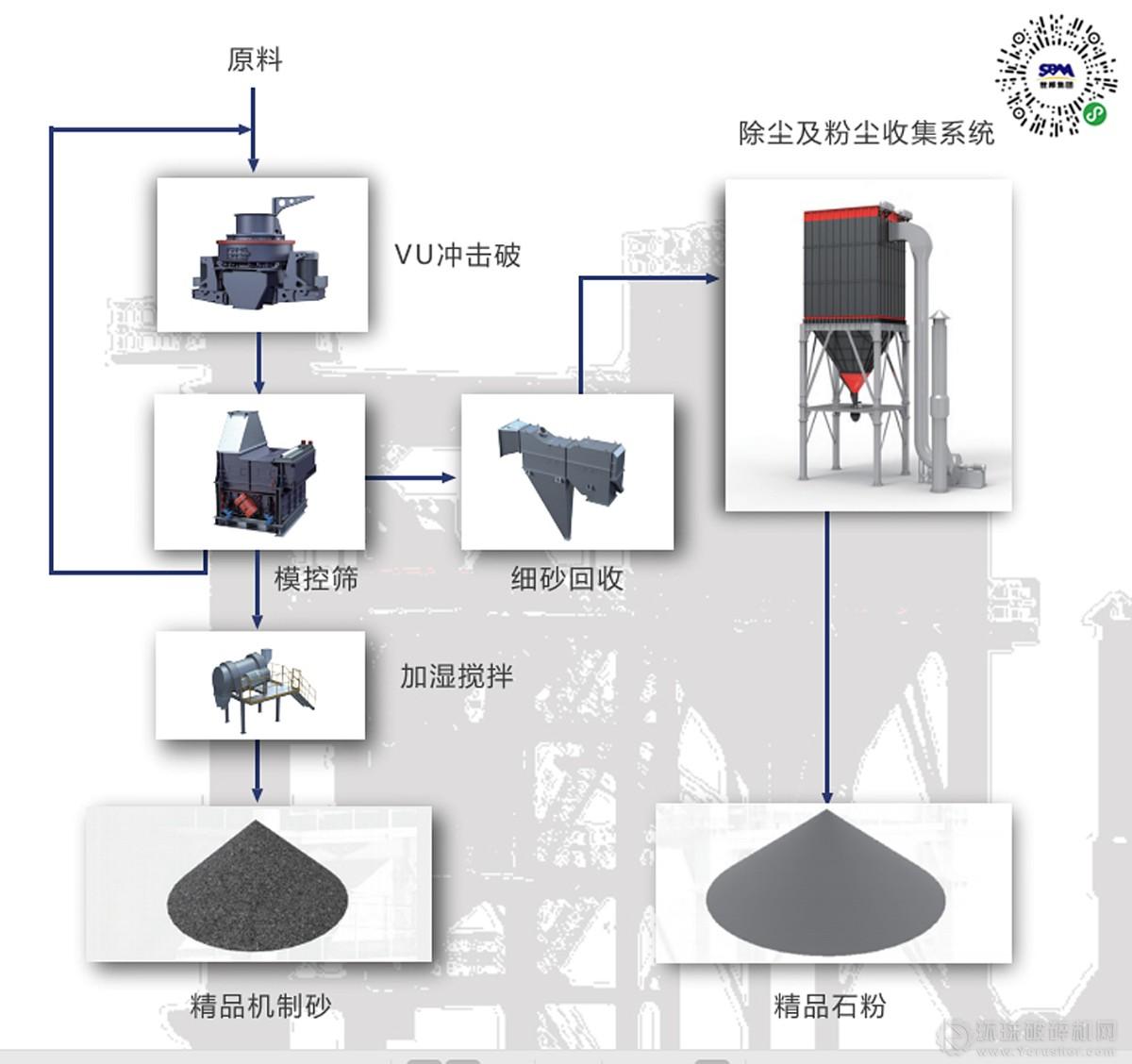原料(可以是石屑、瓜米石等廉價(jià)易得的原料)經(jīng)過VU骨料優(yōu)化系統(tǒng)合理高效的處理后,產(chǎn)出級配合理、粒型圓潤、含粉量可控的成品砂,以及干燥潔凈、可進(jìn)行統(tǒng)一回收利用的高附加值石粉(根據(jù)原料決定可應(yīng)用范圍)。