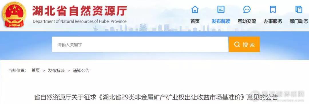 據(jù)了解,日前,湖北省自然資源廳發(fā)布公告,就《湖北省29類非金屬礦產(chǎn)礦業(yè)權(quán)出讓收益市場(chǎng)基準(zhǔn)價(jià)》文件面向社會(huì)征求意見(jiàn)。公告在礦業(yè)權(quán)出讓環(huán)節(jié),將探礦權(quán)采礦權(quán)價(jià)款調(diào)整為礦業(yè)權(quán)出讓收益,礦業(yè)權(quán)出讓收益按照評(píng)估價(jià)值、類似條件的市場(chǎng)基準(zhǔn)價(jià)就高確定,同時(shí)要求礦業(yè)權(quán)出讓收益市場(chǎng)基準(zhǔn)價(jià)由地方國(guó)土資源主管部門參照類似市場(chǎng)條件定期制定,并對(duì)采礦權(quán)出讓收益市場(chǎng)基準(zhǔn)價(jià)計(jì)算進(jìn)行了說(shuō)明。