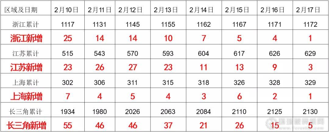 長三角浙江江蘇上海2月10日-17日新冠肺炎確診和新增人數(shù)統(tǒng)計表