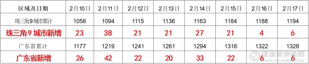 廣東省及珠三角9城市2月10日-17日新冠肺炎確診和新增人數(shù)統(tǒng)計表