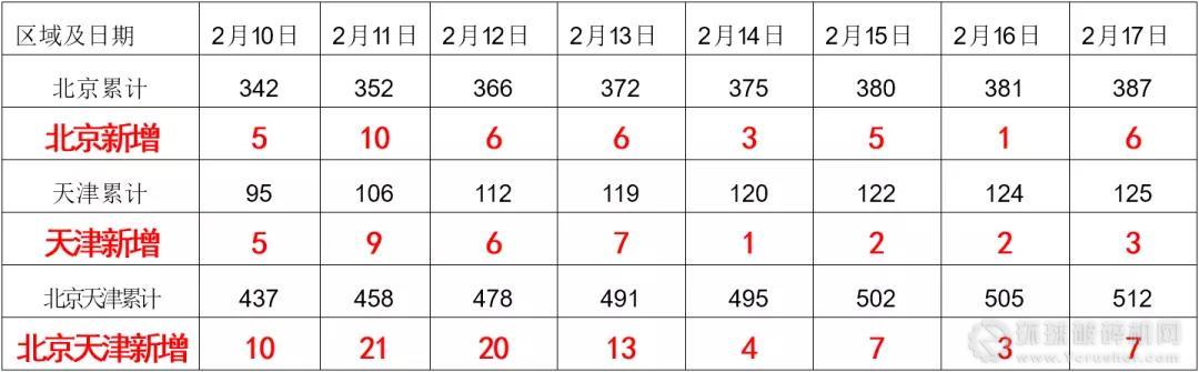 北京天津2月10日-17日新冠肺炎確診和新增人數(shù)統(tǒng)計表