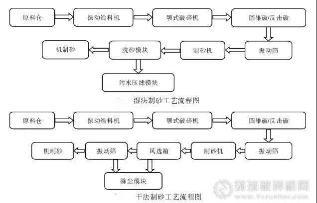 兩種生產工藝方法是相似的,都需要先破碎后篩分。兩者的主要生產設備是基本相同的,即以粗