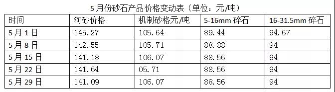 根據(jù)湖北省發(fā)改委數(shù)據(jù)顯示,湖北全省5月份砂石價(jià)格保持了前五個(gè)月低迷態(tài)勢,砂石價(jià)格持續(xù)走低。截止5月29日,除機(jī)制砂外,湖北省砂石產(chǎn)品價(jià)格均有不同程度的下跌,其中河砂價(jià)格下跌明顯,5月份河砂價(jià)格下降超過4元/噸。