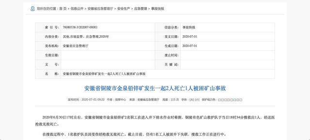 記者從安徽省應(yīng)急管理廳獲悉,2020年6月30日17時(shí)左右,安徽省銅陵市金泉鉛鋅礦2名職工在進(jìn)入井下排水作業(yè)時(shí)暈倒。銅陵有色礦山救護(hù)隊(duì)于當(dāng)日18時(shí)34分搜救出1人,經(jīng)送醫(yī)搶救無效死亡。