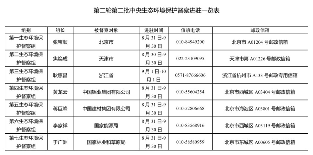 根據安排,第二輪第二批中央生態(tài)環(huán)保督察進駐時間約為1個月。進駐期間,各督察組分別設立專門值班電話和郵政信箱,受理被督察對象生態(tài)環(huán)境保護方面的來信來電舉報,受理舉報電話時間為每天8:00-20:00。