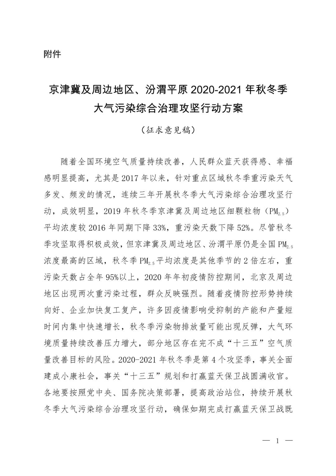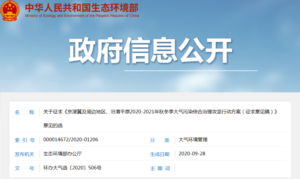 9月28日,生態(tài)環(huán)境部印發(fā)了關(guān)于征求《京津冀及周邊地區(qū)、汾渭平原2020-2021年秋冬季大氣污染綜合治理攻堅(jiān)行動(dòng)方案(征求意見(jiàn)稿)》。