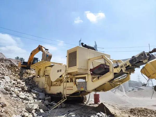 然而由于花崗巖的硬度比較高,在花崗巖礦山的綜合利用階段,架設(shè)固定式破碎處理系統(tǒng)無論從場地和基建成本等多方面因素考慮都顯得優(yōu)勢較小,而廣東磊蒙智能裝備集團(tuán)有限公司以主機(jī)C110顎破搭配HPY圓錐機(jī)的