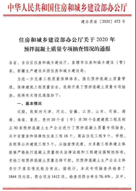 據(jù)悉,住建部對(duì)天津、河北、安徽、江西、山東、河南、湖南、海南、重慶、貴州10個(gè)省(市)30個(gè)在建建筑工程及30家預(yù)拌混凝土生產(chǎn)企業(yè)進(jìn)行了預(yù)拌混凝土質(zhì)量專項(xiàng)抽查,共檢查了1844項(xiàng)內(nèi)容,符合項(xiàng)為1412項(xiàng),檢查項(xiàng)符合率為76.6%。