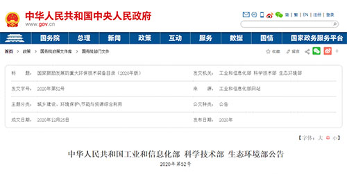 據(jù)了解,2020年12月25日,工業(yè)和信息化部、科學(xué)技術(shù)部和生態(tài)環(huán)境部聯(lián)合發(fā)布2020年第52號(hào)公告——《中華人民共和國(guó)工業(yè)和信息化部 科學(xué)技術(shù)部 生態(tài)環(huán)境部公告》(以下簡(jiǎn)稱《公告》 )。《公告》指出,為加快先進(jìn)環(huán)保裝備研發(fā)和應(yīng)用推廣,提升環(huán)保裝備制造業(yè)整體水平和供給質(zhì)量,工業(yè)和信息化部、科學(xué)技術(shù)部、生態(tài)環(huán)境部聯(lián)合制定了《國(guó)家鼓勵(lì)發(fā)展的重大環(huán)保技術(shù)裝備目錄(2020年版)》。現(xiàn)予公告。