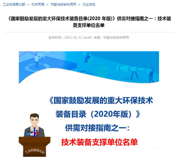 2021年1月15日,工業(yè)和信息化部節(jié)能與綜合利用司發(fā)布了《國(guó)家鼓勵(lì)發(fā)展的重大環(huán)保技術(shù)裝備目錄(2020 年版)》供需對(duì)接指南之一:技術(shù)裝備支撐單位名單——其中,明確指出,濰坊天潔環(huán)保科技有限公司是“礦山粉塵治理成套裝備”關(guān)鍵技術(shù)的主要支撐單位!