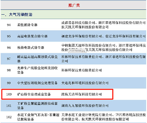 濰坊天潔環(huán)保科技有限公司“礦山粉塵治理成套裝備”列入《國(guó)家鼓勵(lì)發(fā)展的重大環(huán)保技術(shù)裝備目錄》
