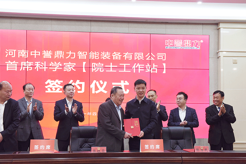 在政府相關領導及在場人員的共同見證下,中國工程院院士張鐵崗、河南中譽鼎力智能裝備有限公司董事長張治民和鄭洛新科技大市場總經理路先鋒順利簽約。