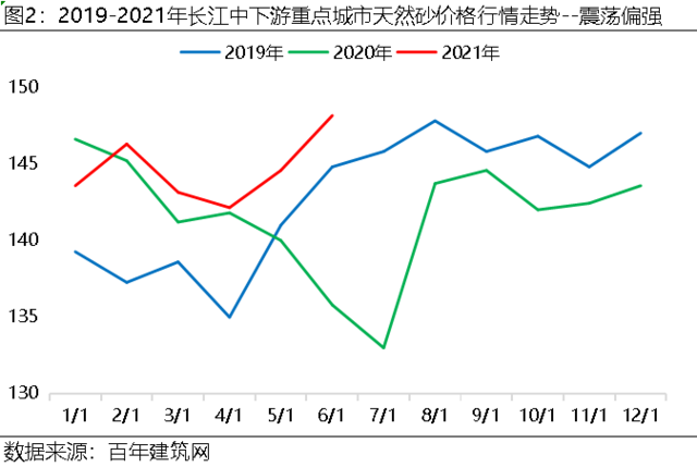 因天然河砂逐漸枯竭,加上長(zhǎng)江流域環(huán)保管制,且取締砂石水上過駁作業(yè),供應(yīng)量減少,運(yùn)輸成本增加,因此下游長(zhǎng)三角天然砂行情保持高位運(yùn)行。