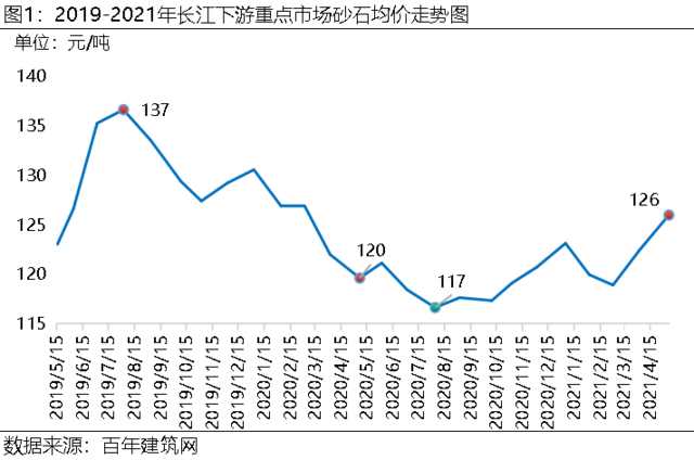 表1:長(zhǎng)三角重點(diǎn)市場(chǎng)砂石均價(jià)對(duì)比情況(單位:元/噸)從表一可以看出價(jià)差大幅收窄,截至2021年5月8日同比收窄約65%,其中2019年長(zhǎng)三角市場(chǎng)天然砂價(jià)格在8月初最大值148元/噸,4月份最低值135元/噸;2020年1月份最大值147元/噸,最低值130元/噸,價(jià)差擴(kuò)大為17元/噸;目前2021年天然砂最高值148元/噸,最低值142元/噸,價(jià)差為6元/噸。