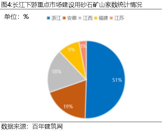 據(jù)統(tǒng)計(jì),華東長(zhǎng)江下游安徽、浙江、江蘇、福建、江蘇建設(shè)用砂砂石礦山家數(shù)一共有119家,其中浙江市場(chǎng)占比51%,安徽占比19%,江西占比18%,福建占比9%,江蘇占比3%。