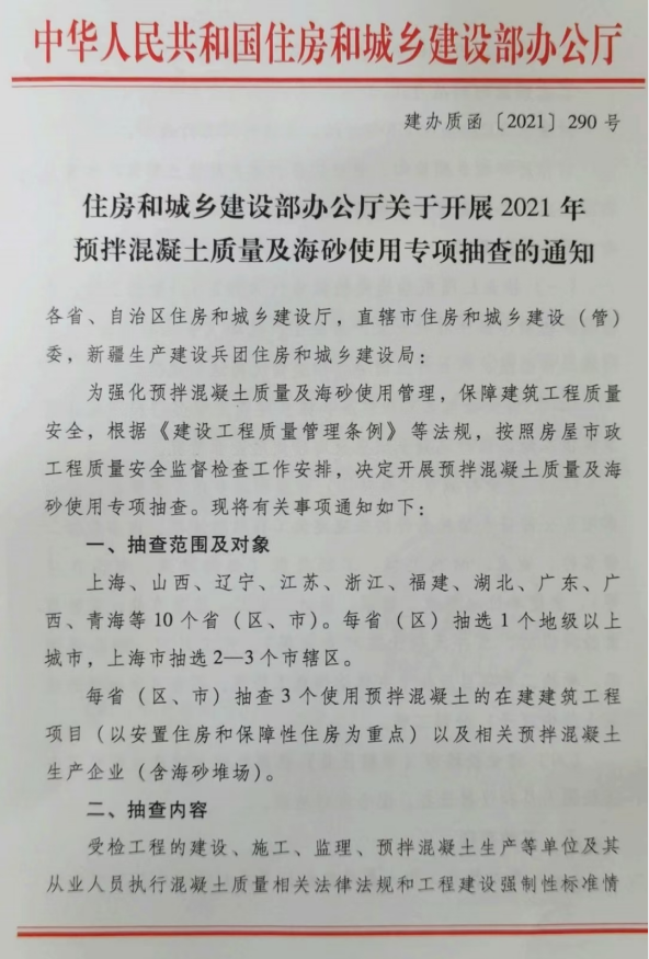 近日,住建部發(fā)布關(guān)于開展2021預(yù)拌混凝土質(zhì)量及海砂使用專項(xiàng)抽查通知。
