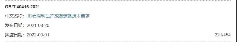 2021年8月20日,國(guó)家市場(chǎng)監(jiān)督管理總局(國(guó)家標(biāo)準(zhǔn)化管理委員會(huì))批準(zhǔn)發(fā)布了450項(xiàng)推薦性國(guó)家標(biāo)準(zhǔn)和4項(xiàng)國(guó)家標(biāo)準(zhǔn)修改單(2021年第11號(hào)),其中包括GB/T40416-2021《砂石骨料生產(chǎn)成套裝備技術(shù)要求》國(guó)家標(biāo)準(zhǔn),自2022年3月1日起實(shí)施。
