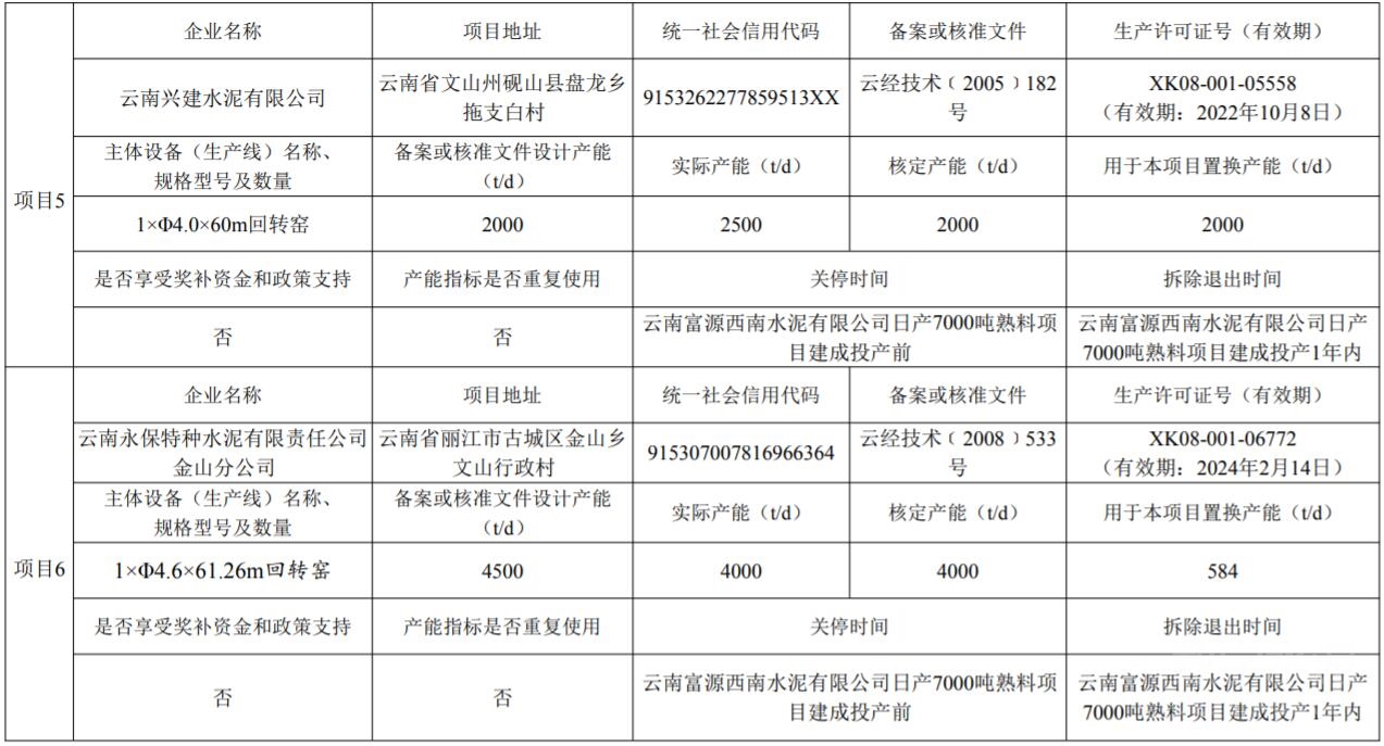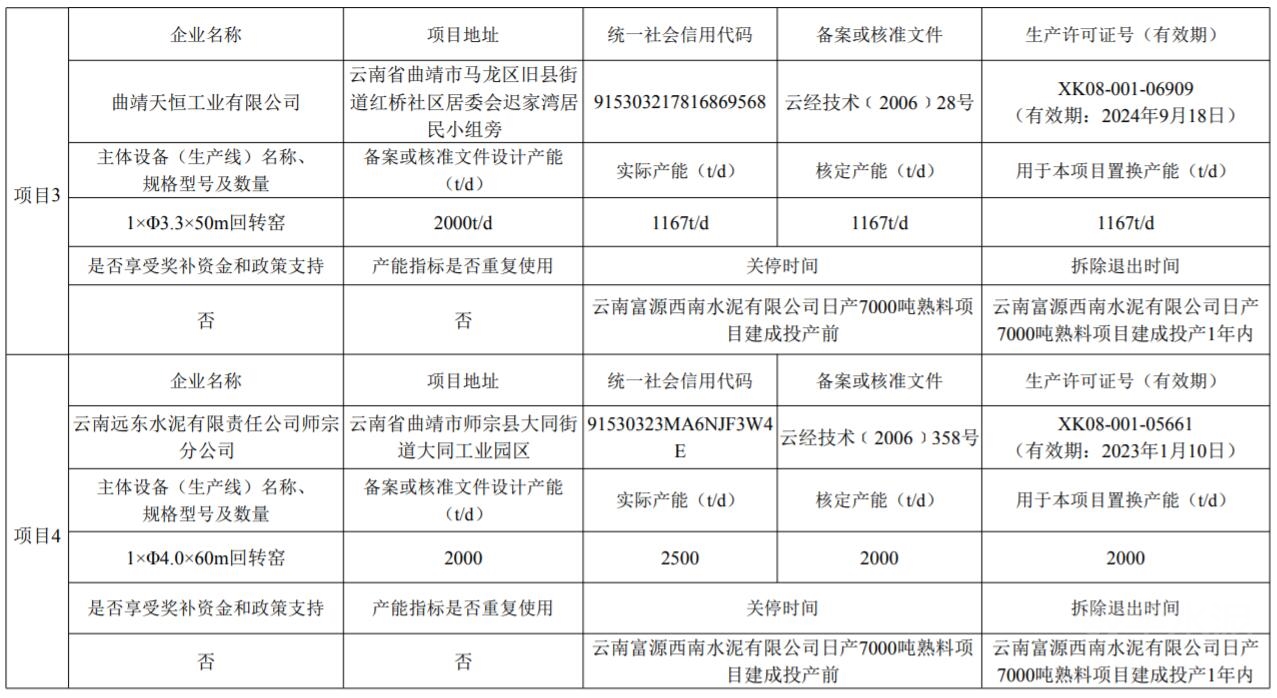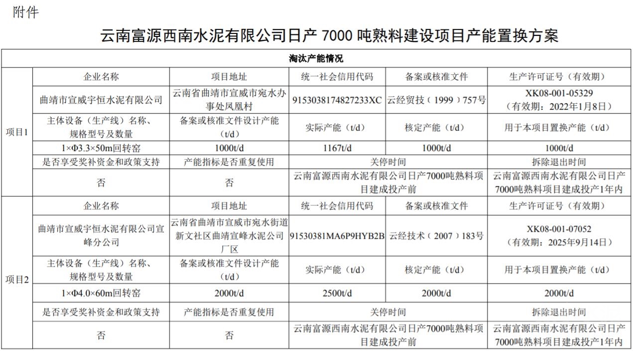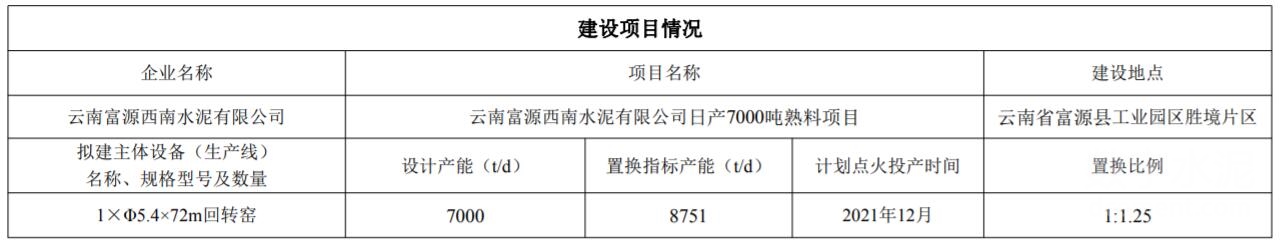 據(jù)云南省工信廳2020年12月公布《云南富源西南水泥有限公司日產(chǎn) 7000 噸熟料建設(shè)項(xiàng)目產(chǎn)能置換方案》新建生產(chǎn)線位于云南省富源縣工業(yè)園區(qū)勝境片區(qū)設(shè)計(jì)產(chǎn)能7000t/d(關(guān)鍵設(shè)備為Φ5.4×72m回轉(zhuǎn)窯一臺(tái))。置換指標(biāo)產(chǎn)能8751t/d,置換比例1:1.25,計(jì)劃點(diǎn)火時(shí)間為今年底2021年12月。