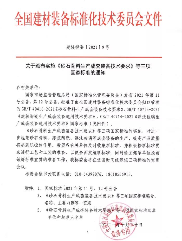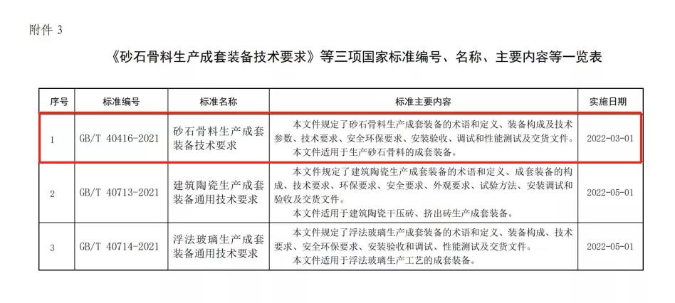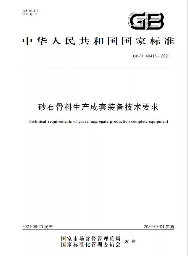 近日,國家市場監(jiān)督管理總局(國家標(biāo)準(zhǔn)化管理委員會)發(fā)布2021年第11號公告、第12號公告,批準(zhǔn)了由全國建材裝備標(biāo)準(zhǔn)化技術(shù)委員會歸口管理的GB/T 40416-2021《砂石骨料生產(chǎn)成套裝備技術(shù)要求》等國家標(biāo)準(zhǔn),并將于2022年3月1日起正式實施。