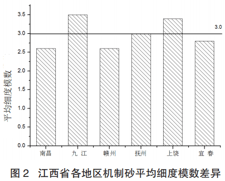 由圖表 1、2 可以得出:江西省機(jī)制砂細(xì)度模數(shù)均值為 3.0,即為中砂。南昌地區(qū)細(xì)度模數(shù)最小為 2.1,最大為 2.8,平均值為 2.6,離散較大,其普遍以中砂為主,低于江西省機(jī)制砂細(xì)度模數(shù)平均值。九江、贛州、撫州、上饒地區(qū)機(jī)制砂細(xì)度模數(shù)較為穩(wěn)定,離散不大。九江和上饒地區(qū)機(jī)制砂平均細(xì)度模數(shù)分別為 3.5 和 3.4,達(dá)到粗砂標(biāo)準(zhǔn),顯著高于江西省機(jī)制砂細(xì)度模數(shù)平均值。撫州地區(qū)機(jī)制砂平均細(xì)度模數(shù)與江西省機(jī)制砂細(xì)度模數(shù)平均值相同。贛州地區(qū)機(jī)制砂平均細(xì)度模數(shù)為 2.6,低于江西省機(jī)制砂細(xì)度模數(shù)平均值,且與南昌地區(qū)相當(dāng)。宜春地區(qū)細(xì)度模數(shù)最小為 2.1,最大為 3.2,平均值為 2.8,離散較大,且粗砂、中砂兼有,機(jī)制砂平均細(xì)度模數(shù)低于江西省機(jī)制砂細(xì)度模數(shù)平均值。從六個(gè)地區(qū)機(jī)制砂細(xì)度模數(shù)平均值可以看出,最小為 2.6,最大為 3.5,且省內(nèi)平均細(xì)度模數(shù)為 3.0,省內(nèi)機(jī)制砂分布離散較大。其中九江、上饒地區(qū)機(jī)制砂細(xì)度模數(shù)偏大,因其地域性原因(九江地區(qū)市場能夠供應(yīng)細(xì)度模數(shù)在 1.6 左右的細(xì)砂互摻使用,上饒地區(qū)同等強(qiáng)度等級(jí)混凝土配合比膠凝材料用量普遍高于其他地區(qū)),能夠改善因機(jī)制砂偏粗造成混凝土和易性差。