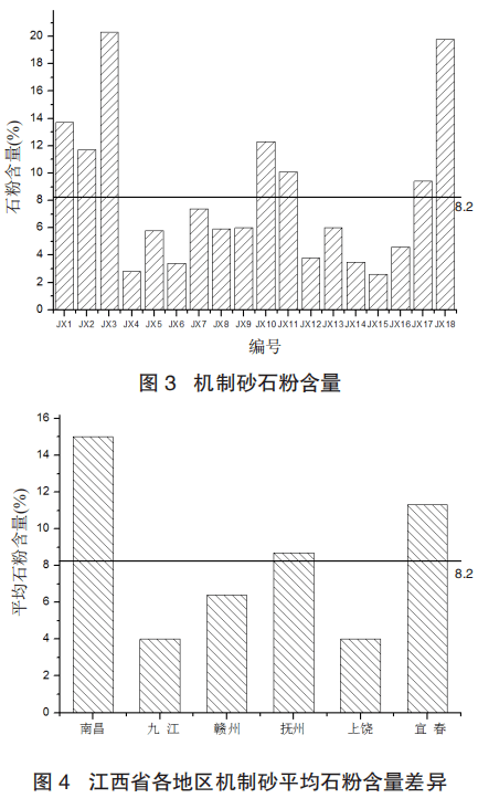 由圖表 3 和 4 可以看出:江西省地區(qū)機(jī)制砂平均含粉量為 8.2%。其中九江、贛州、上饒地區(qū)機(jī)制砂石粉含量相對(duì)穩(wěn)定,離散較小。南昌、撫州、宜春地區(qū)機(jī)制砂石粉含量相差較大,離散較大。從各個(gè)地區(qū)分析,南昌地區(qū)平均石粉含量為 15.0%,顯著高于江西省地區(qū)石粉含量平均值,且所取的單個(gè)機(jī)制砂石粉含量均高于省內(nèi)機(jī)制砂石粉含量平均值。九江地區(qū)石粉含量為 4.0%,顯著低于省內(nèi)機(jī)制砂石粉含量平均值,且石粉含量相對(duì)穩(wěn)定。贛州地區(qū)石粉含量為 6.4%,低于省內(nèi)機(jī)制砂石粉含量平均值,但其石粉含量普遍高于九江地區(qū)。撫州地區(qū)石粉含量為 8.7% 與省內(nèi)機(jī)制砂石粉含量平均值相近,其機(jī)制砂石粉含量分布區(qū)間較廣,高于或低于省內(nèi)機(jī)制砂石粉含量平均值的石粉含量均存在。上饒地區(qū)石粉含量為 4.0%,顯著低于省內(nèi)機(jī)制砂石粉含量平均值,與九江地區(qū)石粉含量相當(dāng)。宜春地區(qū)平均石粉含量為 11.3%,顯著高于江西省地區(qū)石粉含量平均值,其機(jī)制砂石粉含量分布區(qū)間較廣,高于或低于省內(nèi)機(jī)制砂石粉含量平均值的石粉含量均存在,在所取機(jī)制砂 6 個(gè)區(qū)域中機(jī)制砂石粉含量離散最大。