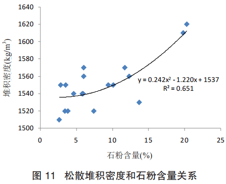 為了討論機(jī)制砂的石粉含量和堆積密度之間的關(guān)系,將試驗(yàn)數(shù)據(jù)關(guān)系分析如圖 11 所示,機(jī)制砂的石粉含量與堆積密度呈二次函數(shù)關(guān)系,隨著石粉含量的增大機(jī)制砂的堆積呈二次函數(shù),隨著石粉含量增加逐步升高,二次函數(shù)的相關(guān)系數(shù)是 R2=0.651,表明兩者相關(guān)關(guān)系較大。原因是當(dāng)石粉含量提高,機(jī)制砂填充更為充分,因此松散堆積密度逐步增加。