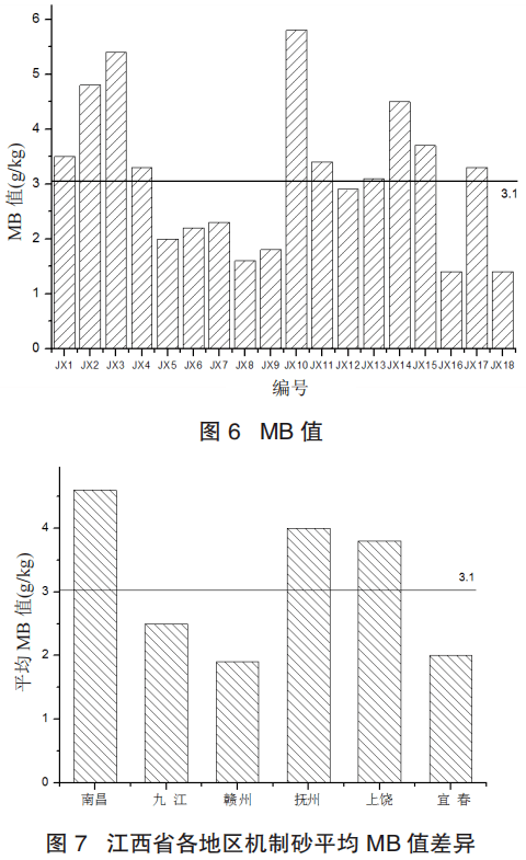 由表 5、表 6 和圖 6、圖 7 可以看出:江西省內(nèi)機(jī)制砂 MB 值平均值為 3.1g/kg,已顯著高于國家標(biāo)準(zhǔn) GB/T 14684—2011《建設(shè)用砂》中砂的 MB 值不得大于 1.4g/kg 的指標(biāo)。南昌地區(qū)平均 MB 值為 4.6g/kg,顯著高于江西省內(nèi)機(jī)制砂平均 MB 值,MB 值離散較大。九江地區(qū)平均 MB 值為 2.5g/kg,低于江西省內(nèi)機(jī)制砂 MB 值平均值,但依然高于國家標(biāo)準(zhǔn)規(guī)定值,離散較小。贛州地區(qū)平均 MB 值為 1.9g/kg,顯著低于江西省內(nèi)機(jī)制砂 MB 值平均值,但依然高于國家標(biāo)準(zhǔn)規(guī)定值,離散較小,為所選地區(qū)中 MB 值平均值最低。撫州地區(qū)平均 MB 值為 4.0g/kg,顯著高于江西省內(nèi)機(jī)制砂 MB 值平均值,離散大。上饒地區(qū)平均 MB 值為 3.8g/kg,高于江西省內(nèi)機(jī)制砂 MB 值平均值,且所有樣品 MB 值均高于江西省內(nèi)機(jī)制砂 MB 值平均值,離散較大。宜春地區(qū)平均 MB 值為 2.0g/kg,顯著低于江西省內(nèi)機(jī)制砂 MB 值平均值,但依然高于國家標(biāo)準(zhǔn)規(guī)定值。但宜春區(qū)域所選機(jī)制砂中,兩個(gè)樣品符合國家標(biāo)準(zhǔn) GB/T 14684—2011《建設(shè)用砂》中砂的 MB 值不得大于 1.4g/kg 的指標(biāo),因其離散大,造成平均 MB 值偏高。