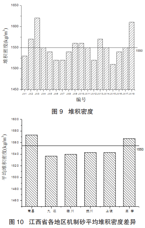 根據(jù)國家標(biāo)準(zhǔn) GB/T 14684—2011《建設(shè)用砂》中砂的松散堆積密度不小于 1400kg/m3,將全省機(jī)制砂松散堆積密度測試所得的數(shù)據(jù)進(jìn)行作圖分析,如表 7、表 8 和圖 9、圖 10 所示。