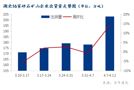 截至2022年4月20日,百年建筑網(wǎng)調(diào)研湖北16家砂石企業(yè),周度總出貨量共計(jì)203.2萬(wàn)噸,較上周環(huán)比增長(zhǎng)14%。主要是因?yàn)閭€(gè)別砂石廠家先前受安全檢查,一直沒(méi)有開(kāi)工,本周開(kāi)始正常生產(chǎn),因此砂石總出貨量較上周有所增加。預(yù)計(jì)下周價(jià)格穩(wěn)中偏強(qiáng)運(yùn)行,出貨量或?qū)⑿》嵘?/div>