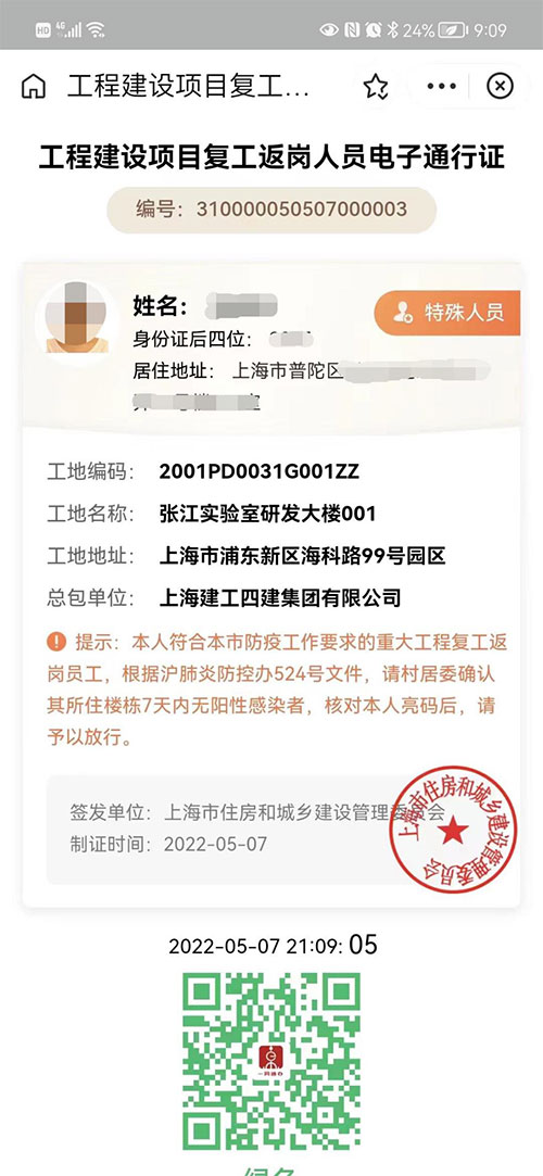 5月7日,上海市住房城鄉(xiāng)建設(shè)管理委為張江實驗室研發(fā)大樓項目發(fā)出了全市首張工程建設(shè)項目復(fù)工返崗人員電子通行證(簡稱“復(fù)工證”)。