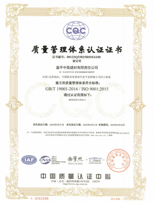 近日,經(jīng)中國檢驗認證中心專家組實地嚴格審驗,陜煤新材集團富平公司建立的質(zhì)量管理體系符合標準:GB/T 19001-2016/ISO 9001:2015 ,順利通過質(zhì)量管理體系認證,標志著富平公司已具備科學穩(wěn)定的質(zhì)量管理能力,能夠為客戶提供一流的砂石骨料產(chǎn)品,為踐行陜煤新材集團“精耕細作,技藝精湛”質(zhì)量理念提供了有力支撐。